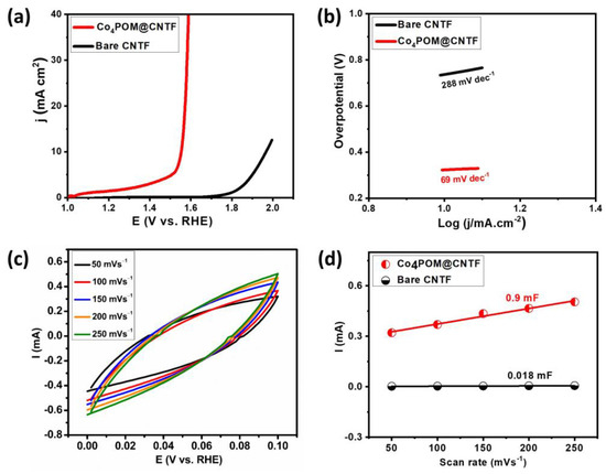 Figure 4c depicts the cyclic voltammograms at different scan rates, i.e., from 50 to 250 mVs−1 in the non-Faradic region, to assess the ECSA of bare and Co4POM-modified electrodes. The plot of anodic current versus scan rate at a potential from 0 to 0.1 V versus RHE, as illustrated in Figure 4d, yielded a straight line where the slope obtained with linear fitting showed the double-layer capacitance (Cdl) of the respective electrodes. By comparing the Cdl value of the bare CNTF with that of Co4POM@CNTF, Co4POM@CNTF had a higher Cdl value of 0.9 mF owing to the higher surface area and thereby more active sites, resulting in higher efficiency. ECSA was calculated by applying Equation (1).