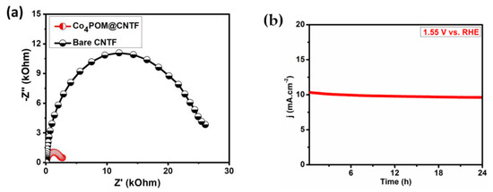 (a) Nyquist plot for the bare CNTF and Co4POM@CNTF; (b) stability test for Co4POM@CNTF in 0.1 M KOH for 24 h at 1.55 V versus RHE.