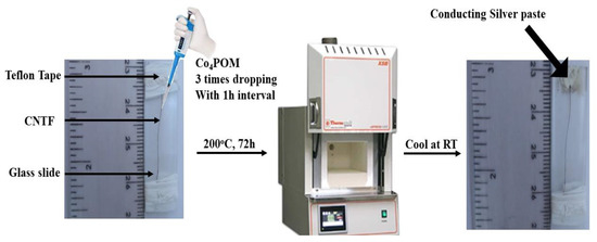 CNTF about 2.5 cm long was fixed onto a glass slide by binding both its ends with Teflon tape. A concentrated POM solution was drop-casted thrice onto CNTF with one hand, and the glass plate was dried in an oven at 70 °C. The fabricated electrode was then thermally treated at 120 °C for 72 h in a furnace followed by washing with water [57]. Lastly, the Teflon tape was removed from one end, which was sealed with conducting silver paste to produce the electrode connection. Figure 6 depicts electrode fabrication by drop casting.