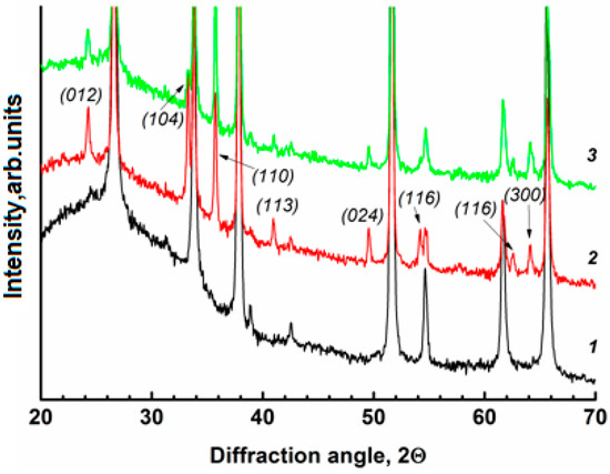 X-ray diffraction patterns of the samples: (1) conductive glass F:SnO2 (FTO); (2) Fe2O3/FTO; (3) Ti4+/Fe2O3/FTO. The curves are displaced vertically for clarity. Diffraction peaks of hematite (α-Fe2O3) are marked (ICDD card 33-0664).