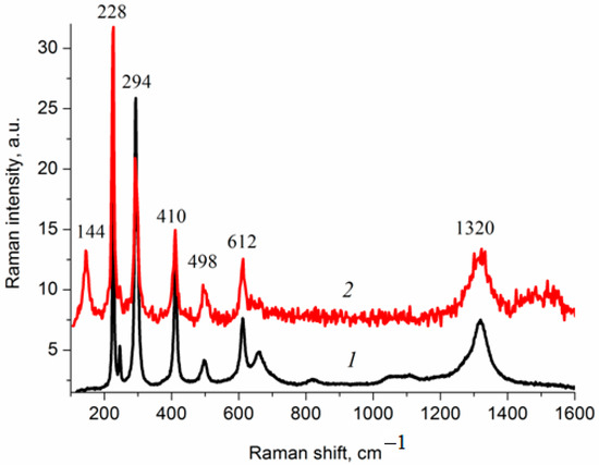 Raman spectra of photoanode samples: (1) Fe2O3/FTO; (2) Ti4+/Fe2O3/FTO. The curves are displaced vertically for clarity.