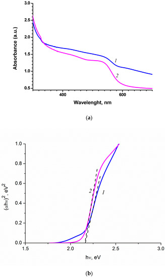 Absorption spectra of film photoanodes: (1) Fe2O3/FTO; (2) Ti4+/Fe2O3/FTO (a) and dependence of (αhv)2 on photon energy hν for film photoanodes: (1) Fe2O3/FTO; (2) Ti4+/Fe2O3/FTO (b).