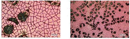 The structure and morphology of the initial electrodeposited α-Fe2O3 films, as well as their optical properties, correlate well with the literature data [29]. Microphotographs of the surface of titanium-doped hematite films (Figure 4) demonstrate that the films are homogeneous, dense and contain some defects.