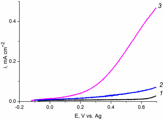 Figure 10 shows the polarization curve of the photoelectrochemical process occurring on a Ti4+/Fe2O3/FTO film photoanode in a background 0.1 M KOH electrolyte containing 5,6,7,8-tetrahydro-2-naphthol (curve 3). A well-pronounced wave of direct photoelectrochemical oxidation of 5,6,7,8-tetrahydro-2-naphthol is observed in the potential range 0–0.7 V vs. Ag. It can be assumed that at higher potentials this substance will also be subject to oxidation by the OH• radicals formed during the photoelectro-oxidation of water, the potential of which (2.06 V) [38] is also sufficient to oxidize the substrate. Composition of the degradation products is very complex and is the subject of ongoing research.