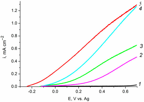 Polarization curves of a Ti4+/Fe2O3/FTO film photoanode measured: (1) in dark conditions, and (2–5) under visible light illumination with a power density of 100 mW cm−2 in aqueous solutions of (2) 0.1 M KOH; (3) 0.1 M KOH + 20% CH3OH; (4) 0.1 M KOH + 20% C2H4(OH)2; and (5) 0.1 M KOH + 20% C3H5(OH)3.