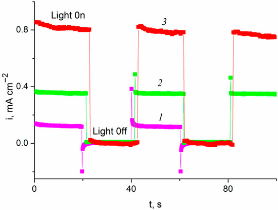 Photocurrent transients obtained at E = 0.4 V on the film photoanode Ti4+/Fe2O3/FTO in dark conditions and under visible light illumination with a power of 100 mW cm−2 in aqueous solutions: (1) 0.1 M KOH; (2) 0.1 M KOH + 20% CH3OH; (3) 0.1 M KOH + 20% C3H5(OH)3.