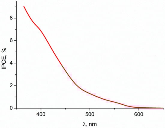 Dependence of the incident photon-to-current conversion efficiency (IPCE%) of a Ti4+/Fe2O3/FTO film photoanode on the wavelength of monochromatic light in an aqueous solution of 0.1 M KOH + 20% C3H5(OH)3 is shown in Figure 8. It can be seen that the photoactivity manifests itself in the wavelength range of 350–600 nm. Comparison of Figure 8 and Figure 3a shows a good correlation between the IPCE% spectrum and the absorption spectrum for this sample (Figure 3a, curve 2). To quantify the recombination losses during the photoelectro-oxidation of water, methanol, ethylene glycol, and glycerol on a titanium-promoted hematite electrode, the method of Intensity-modulated photocurrent spectroscopy (IMPS) was used [30,31,32,33]. To record the IMPS dependences, we used monochromatic illumination with a wavelength of 452 nm in the visible region, which provides a fairly high value of IPCE% (Figure 8).