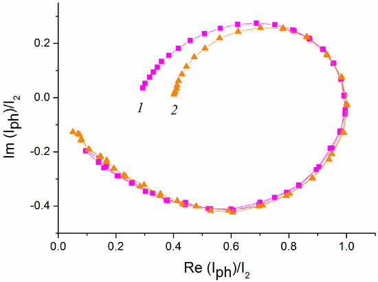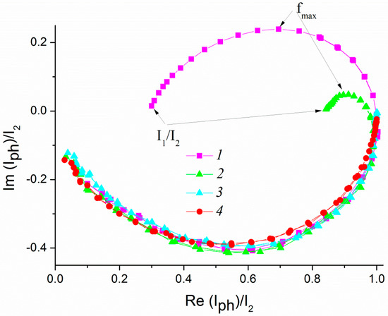The IMPS spectra cross the real axis in the low frequency (LF) region at a photocurrent density I1 and in the medium frequency region at a photocurrent density I2. I1 is the steady-state photocurrent, while I2 is the charge carrier generation current [34]. The generation current expressed in electrical units is the flux of photoexcited minority charge carriers from the bulk of the semiconductor to its surface (i.e., the photocurrent in the absence of surface recombination of holes). Figure 9 shows the IMPS spectra normalized to I2. The point of intersection of the normalized IMPS spectrum with the real axis in the LF region corresponds to I1/I2 and shows the fraction of recombination losses during the electrocatalytic oxidation of depolarizers. It is seen from Figure 9 that significant surface recombination of photogenerated electron-hole pairs is observed in aqueous solution of 0.1 M KOH. At a potential of 0.4 V, the photocurrent makes 28% and the recombination loss is 72% of the hole generation current. It can also be seen from Figure 9 that the introduction of 20% CH3OH into 0.1 M KOH aqueous solution reduces the recombination losses at the photoanode from 72 to 16%. This results from the principal role of photoinduced holes in the process of photoelectro-oxidation of CH3OH molecules. The introduction of 20% C2H4(OH)2 or C3H5(OH)3 into the solution reduces the recombination losses in the photoanode almost down to zero (Figure 9, curves 3 and 4). Thus, these depolarizers are more efficiently oxidized by photogenerated holes than water and CH3OH molecules.