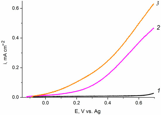 Polarization curves of a Ti4+/Fe2O3/FTO film photoanode measured: (1) in dark conditions, and (2, 3) under visible light illumination with a power density of 100 mW cm−2 in aqueous solutions of 0.1 M KOH and 0.1 M KOH + 0.01 mM 5,6,7,8-tetrahydro-2-naphthol, respectively.