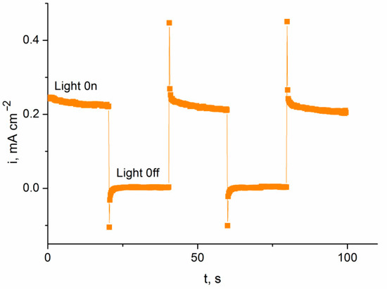 Photocurrent transients of a Ti4+/Fe2O3/FTO film photoanode measured in an aqueous solution of 0.1 M KOH + 0.01 mM 5,6,7,8-tetrahydro-2-naphthol at E = 0.4 V in dark conditions and under visible light illumination with a power density of 100 mW cm−2.