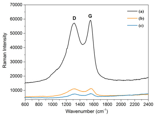 Raman spectra of PAC (a), Fe3O4-PAC (b), and Cu-Fe3O4-PAC (c).