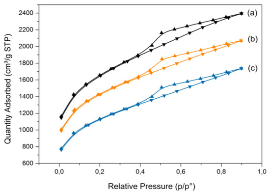 The measurement of the porosity and surface area of the PAC, Fe3O4-PAC, and Cu-Fe3O4-PAC materials was carried out through the Brunauer–Emmett–Teller (BET) analysis as shown in Figure 5 and Table 1. The N2 adsorption–desorption isotherm of all the carbon materials show a typical IV type pattern, according to the International Union of Pure and Applied Chemistry (IUPAC) classification, suggesting that these materials have mesoporous structures (Figure 5) [36]. Furthermore, the isotherms chang in a relatively slight range of pressure, which further indicates that the pore structure of these materials is regular and the pore size distribution is uniform [37,38].