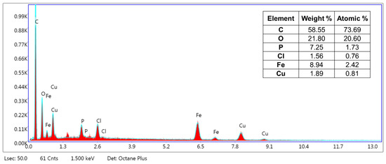 EDX spectrum of the Cu-Fe3O4-PAC catalyst.