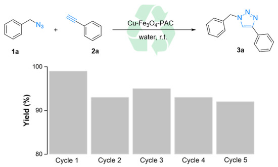 Yields of the Cu-Fe3O4-PAC catalyst in the cycloaddition of benzyl azide (1a) and phenylacetylene (2a) after five cycles of recovery/reuse.