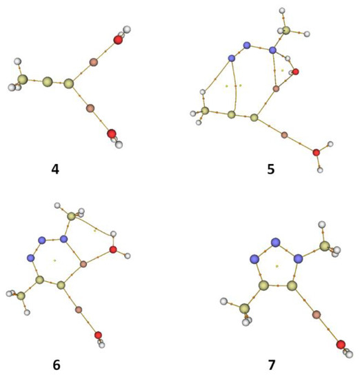 A supporting view to that given by the NBO computations can be provided by the topology analysis of the electron density in the framework of the Quantum Theory of Atom in Molecules (QTAIM) suggested by Bader [45]. The topological analysis of the electron density distribution was carried out by means of Bader’s theory, as implemented in the Multiwfn 3.3.9 software [46]. The topology analysis of the electron density was used to search the critical points. As can clearly be seen from molecular graphs of the studied complexes (Figure 11), the BCPs and bonding lines were clearly found in addition to the ring BCPs.
