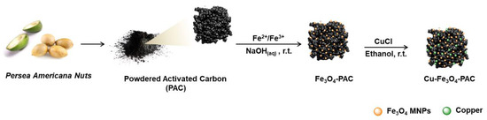 Stepwise synthesis of Cu-Fe3O4-PAC.
