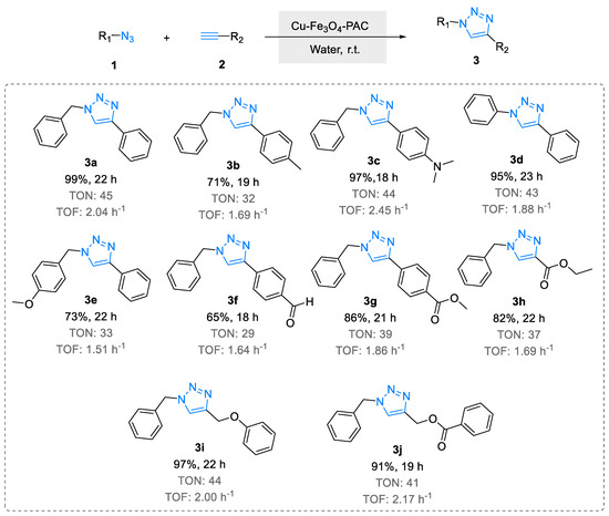 After optimizing the conditions of the Cu-Fe3O4-PAC-catalyzed azide-alkyne [3+2] cycloaddition reaction, the scope and generality of this new protocol were investigated by using several organic azides and terminal alkyne derivatives to regioselectively afford 1,4-disubstituted-1,2,3-triazoles (Scheme 2). The results revealed that the reactions of terminal alkynes and organic azides with both electron-donating and electron-withdrawing substituents did not have any particular effect, with most of them being completed within 23 h as a maximum time and resulting in one regioisomer in high to excellent yields of the final 1,2,3-triazole products (Scheme 2). All the 1,4-disubstituted 1,2,3-triazole isomers were characterized by melting points and NMR spectroscopy. Some of them were purified by recrystallization from a mixture of dichloromethane/hexane when necessary (see Supplementary Materials).