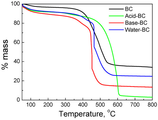 The TGA curve of each biochar has a slight mass loss at low temperatures in the range of 80–130 °C, corresponding to the water adsorbed, and a sharp decrease in higher temperatures, thus, describing the burn of the carbonaceous phase. The starting temperature is different in each biochar and depends on the physicochemical characteristics of the carbonaceous phase. A higher burning temperature is required for the more solid and massive phases produced from lignin, while hemicellulose and cellulose demand lower burning temperatures. In this case, the acid–BC exhibits the higher and the base–BC exhibits the lower burning temperature, while the starting biochar and water–BC are in between (Table 1). As can be seen, there are significant differences, which can be attributed to the influence of the treatment. It is well known that acid solutions can dissolve hemicellulose and cellulose species in biomass, while base solutions are used to remove lignin. Although the pyrolysis process alters the characteristics of biomass and graphitizes the carbon phase, this phase’s characteristics are related to the starting biomass. Treatment with acid or base solutions can alter the speciation and transform the carbonaceous phase to a harder- or easier-to-burn phase. The partially dissolved biochar is also supported by the SEM images (Figures S2 and S3).