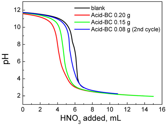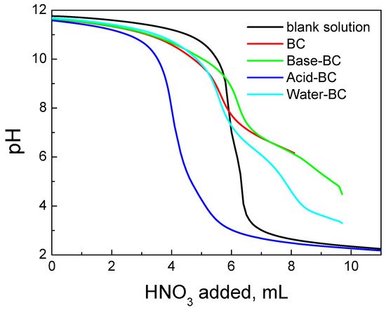 Potentiometric titrations of the studied biochars with the titration of the blank solution.