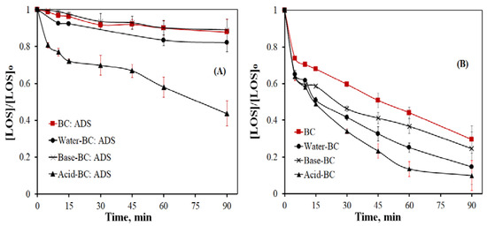 The significant differences in the physicochemical properties of the treated biochars are expected to alter the catalytic performance of the materials. Specifically, the influence of biochar and treated biochars with different physicochemical properties on LOS adsorption and oxidation with persulfate ions was investigated, and the results are displayed in Figure 3. As seen in Figure 3A, the 90 min removal by adsorption of 250 μg/L LOS is 9.8%, 16.5%, 9.8%, and 42% for BC, water–BC, base–BC, and acid–BC, respectively, at inherent pH. There are two different processes during the immersion of biochar into the LOS solution: (i) the consumption or release of ions from the surface depending on the difference of the pH solution and the pzc of the biochar, and more importantly, (ii) the adsorption of LOS. If the adsorption is due to electrostatic forces and not to π–π interactions, then charged groups are involved in the process, and depending on the accumulation of charge on the surface, may be released or consumed by the surface. Thus, the solution pH will be altered. In this case, the starting solution is lower for acid–BC and water–BC (pH = 4.6 and 5.2, respectively), but higher for BC and base–BC (pH = 6.0 and 6.2, respectively). This points out that the adsorption is followed by released from the surface and is favored at a lower pH. The pH increase for BC and base–BC is due to the basicity of the two samples, which firstly increases the pH and then limits the adsorption process, and thus, the acidification of the solution by the release of .