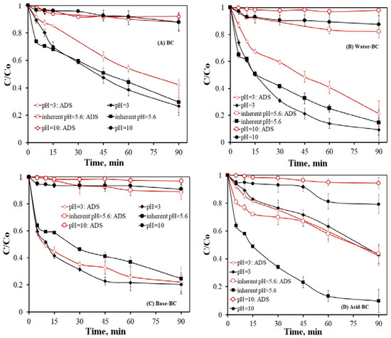 Since biochar treatment changes its surface acidity considerably (Table 1), it was decided that it was necessary to investigate the effect of initial pH on the adsorption and degradation of LOS; the results are shown in Figure 4. It is evident that the initial pH plays a significant role, affecting both the adsorption and degradation of LOS in all tested biochars. This supports the argument that the interplay amongst the surface, LOS, and the oxidant for the adsorption and degradation processes is not only through π–π interactions, but also electrostatic forces, since LOS removal declines as the solution pH increases from 3 to 10. Only in the case of acid–BC does LOS adsorption remain nearly constant at the acidic or near-neutral pH due to the release of from biochar and the acidification of the solution; this results in 56% of LOS removal after 90 min of adsorption at either condition (Figure 4D). However, at pH = 10, LOS adsorption is dramatically reduced to 6%.