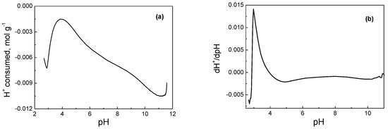 (a) consumed by the surface as a function of the solution pH; (b) the differential curve of the consumed with pH.