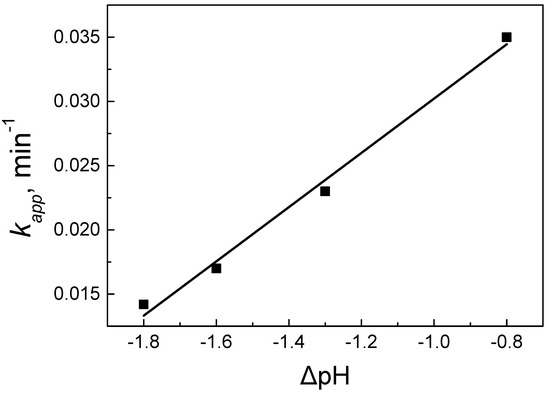 Therefore, the net influence of pH on oxidation should be derived from the subtraction of the two pH values between the adsorption and oxidation processes. Indeed, the linear correlation between the kapp and ΔpH, as presented in Figure 7, confirms the assumption.