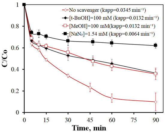 To explore the contribution of reactive species such as sulfate radical (), hydroxyl radical (), and singlet oxygen (1O2) in the oxidation process of 250 μg/L LOS, 100 mM methanol, 100 mM t-butanol, and 1.54 mM sodium azide were used as scavengers for , , and 1O2, respectively. Methanol is considered an effective scavenger for both and , although its reaction rate constant with is approximately 100 times greater than the respective value with HO· [40,41]. On the other hand, t-butanol reacts almost 1000 times faster with than [42], thus, it is regarded mainly as a scavenger [42]. NaN3 has been reported as a sufficient scavenger of 1O2 with a kinetic constant in the order of 109 [24,42,43]. As seen in Figure 8, the addition of 100 mM of either t-butanol or methanol partially impedes LOS degradation in a similar manner, confirming the formation and participation of both free radicals in LOS decomposition. Specifically, the 90 min LOS removal declines from 90% without scavenger to 64% in the presence of either alcohol, while the kapp value is reduced 2.6-fold. The fact that an excess of alcohol cannot completely hinder degradation implies that species other than sulfate and hydroxyl radicals may be involved in the reaction; this seems to be the case, since the addition of sodium azide leads to a 5.4-fold decrease in the degradation rate, verifying that a non-radical pathway driven by singlet oxygen significantly participates in LOS elimination.