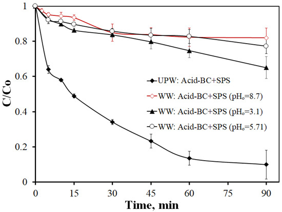Effect of wastewater (WW) on LOS degradation at several pH values. Experimental conditions: (LOS) = 250 μg/L, (SPS) = 250 mg/L, (acid–BC) = 90 mg/L.