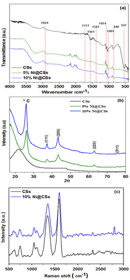 FT-IR spectra of the prepared CSs and Ni@CS composites are illustrated in Figure 1a. The spectrum of the as-synthesized CSs calcined at 700 °C, displaying the following absorption bands: a wide absorption peak from 3000 to 3500 cm−1 due to O-H stretching, a weak peak at 2900 cm−1 assigned to aliphatic C-H stretching modes; characteristic bands at 1614 and 1717 cm−1 are attributed to C=C and C=O modes, respectively, and bands between 500 and 900 cm−1 are mainly related to C-H bending modes. The FT-IR spectra of the (5 and 10%) Ni@CS composites are virtually identical. However, the absorption bands’ growth was reduced after the loading of the Ni NPs, implying that the CSs’ surface functionality remained intact.