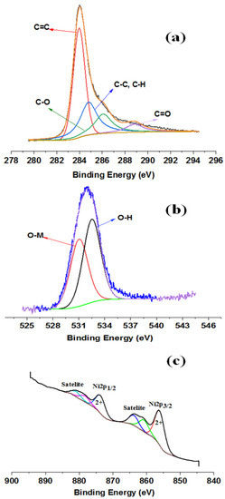 The valence state and electron binding energy of Ni immobilized on the carbon spheres were determined using XPS. The O1s region, the C1s region, and the 2p region of Ni were examined using the Gaussian–Lorentzian approach, as displayed in Figure 2 and Table 1. The XPS spectrum of high-resolution C1s (Figure 2a) reveals three peaks at 284, 286.9, and 288.6 eV, which related to the C=C, C–O, and C=O moieties, respectively. The (C-O-C) and hydroxyl (OH) binding energies were 531.4 and 531.1 eV, respectively, in the O1s (Figure 2b). The high-resolution Ni2p spectrum in Figure 2c shows two edge-splits by spin coupling: the 2p3/2 major peak at approximately 855.3 eV and its shoulder at about 863 eV, and the fitting 2p1/2 peak at 872.5 eV and its shoulder at 878.5 eV, indicating the presence of NiO species [25]. The surface atomic composition obtained from the XPS data is also shown in Table 1. The concentration of Ni on the CSs’ surface is found to be lower than that in the bulk when compared to the Ni bulk concentration determined by AAS.