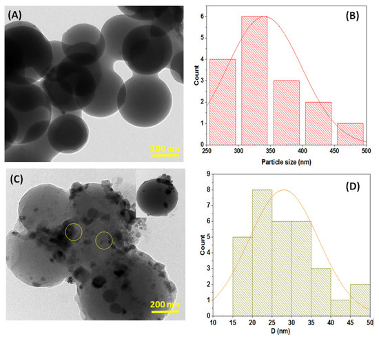 HRTEM revealed the morphology and particle size distribution histograms of the CS and Ni@CS samples, as shown in Figure 3. The CSs with flat surfaces were uniformly dispersed and had well-defined, homogeneous, spherical shapes, as depicted. Furthermore, after the immobilization of Ni NPs, the shape of the CSs was unaffected. HRTEM images were used also to determine the particle size distribution and average particle size. The average particle size of the CSs was 240 nm (Figure 3B), and the average particle size of nickel oxide species immobilized on the CSs was 26 nm (Figure 3D). Furthermore, the TEM image of the Ni@CSs displays the existence of evenly distributed NiO species on the carbon spheres with no agglomeration into big clusters.