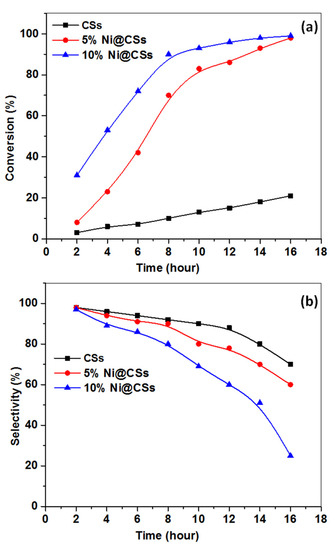 The conversion and selectivity of a wider spectrum of alkenes at 353 K, pH 8, with the use of acetonitrile are presented in Table 2. The 10% Ni@CSs appeared to be the most powerful of the tested catalysts; hence, that was chosen as the catalyst for the subsequent epoxidation measurements. It is obvious from the table that the cyclooctene and cyclohexene exhibited the highest conversions. The low-basicity of the π-electron moiety, steric hindrance, or the tautomerization phenomenon may be to blame for the epoxidation’s decreased electrophilic cycloaddition [28,29,30]. The cyclohexene conversion was 98% (for cyclohexene), 99% (for cyclooctene), 89% (for styrene), 93% (for oct-1-ene), and 60% (for prop-2-en-1-ol).