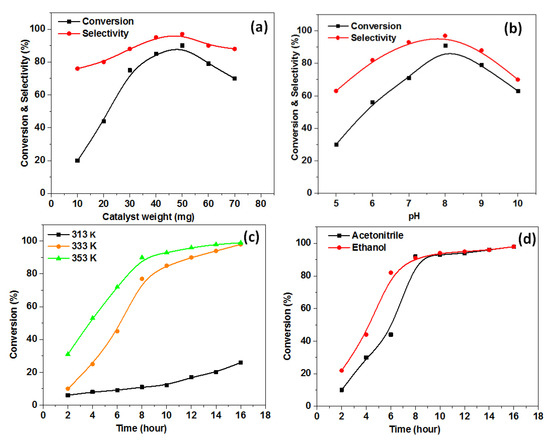 Optimum reaction conditions of the catalytic epoxidation of cyclohexene using 10% Ni@CSs composite: (a) effect of catalyst dose (353 K, pH = 8, and 14 h); (b) effect of pH (50 mg catalyst, 353 K, and 14 h); (c) effect of temperature (50 mg catalyst, pH = 8, and 14 h); and (d) effect of solvent (50 mg catalyst, 353 K, pH = 8).