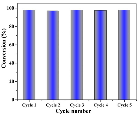 Catalyst durability is a major issue in heterogeneous catalysis as it provides for more cost-effective and ecologically friendly processes. As a result, we investigated the reusability of the catalyst in the epoxidation of cyclohexene (Figure 6). The catalyst can be readily separated by filtration, rinsed with ethanol, dried, and reutilized for subsequent reactions after each reaction cycle. Obviously, the catalyst can be reused at least five times without losing its catalytic performance. Furthermore, applying the AAS assessment, nickel species detached from the carbon spheres’ surfaces was investigated in the reaction mixture after the process was completed. The results revealed no trace amounts of nickel leached into the solution. The groups’ functionality on the surface of carbon spheres provides potential interacting sites with nickel species, thus offering facile catalyst reusability and minimizing metal detachment.