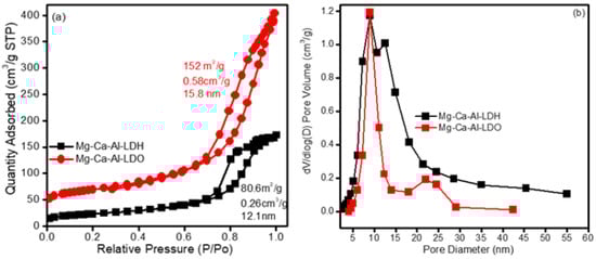 The synthesized Mg-Ca-Al-LDH exhibited a surface area of 80.6 m2/g and pore volume of 0.26 cm3/g, whereas the calcined Mg-Ca-Al-LDO showed a high surface area i.e., 152 m2/g with a pore volume of 0.58 cm3/g. The high surface area and pore volume of Mg-Ca-Al-LDO could be due to the removal of water and carbon dioxide during the calcination process, which can lead to the formation of channels and pores, which are accessible to the nitrogen molecules, and could increase the surface area of Mg-Ca-Al-LDO. These findings agree with those of previous studies, which report surface areas of between 60 and 200 m2/g [,]. The higher surface area could provide more adsorption sites, which are beneficial for adsorption of pollutants, and one can conclude that the Mg-Ca-Al-LDO had more effective adsorption sites than Mg-Ca-Al-LDH due to its higher surface area.