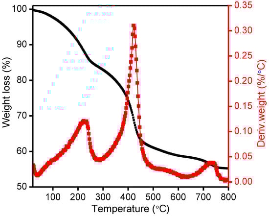 To investigate the thermal stability of as synthesized Mg-Ca-Al-LDH sample, TG/DTG analysis was conducted, and the results are presented in Figure 2. As shown in Figure 2, the LDH material typically showed three major mass loss steps at various temperatures []. The first mass loss stage was observed up to 50–230 °C with mass loss of 17%, which is related to loss of water molecules from the surface and interlayer sheet. The second mass loss stage, up to 425 °C, is due to the decomposition of the interlayer carbonate anions and dehydroxylation of the LDH sheets. In this temperature range, the hydrotalcite undergoes decarbonation and dehydroxylation reactions that generate carbon dioxide and water [,]. Finally, a third stage of mass loss up to 750 °C was assigned to the completion of the transformation into a mixed metal oxide lattice []. Therefore, the fermentation results demonstrate that Mg-Ca-Al-LDH has greater thermal stability and this observation is concordant with the reported literature []. From the results discussed above, for the investigation of the Cr and EBT removal via adsorption through the reconstruction mechanism, the Mg-Ca-Al-LDH sample was calcined at 500 °C.