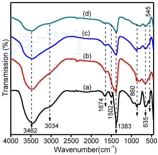 Figure 4 shows the FTIR spectra for Mg-Ca-Al-LDH, Mg-Ca-Al-LDO and Mg-Ca-Al-LDO after Cr and EBT adsorption. As seen in Figure 4a, Mg-Ca-Al-LDH displayed a broad band at approximately 3034–3462 cm−1 related to the –OH stretching vibration mode, caused by the interlayer water molecules and hydroxyl groups in the LDH layers []. The weak band observed at 1674 cm−1 was assigned to the bending vibration of H2O from the interlayer water []. The peaks at 1502 and 1383 cm−1 are characteristic absorption peaks related to the asymmetric stretching vibration of interlayer carbonate []. The bands in the fingerprint region between 860–545 cm−1 were attributed to metal–oxygen–metal and oxygen–metal–oxygen functional groups, such as Mg-O, Al-O and Ca-O []. In the FT-IR spectrum of Mg-Ca-Al-LDO (Figure 4b), the bands at 3434 cm−1, 1632 cm−1 and 450–900 cm−1 were consistent with the Mg-Ca-Al-LDH, the bands at 1502 and 1418 cm−1 also indicate the asymmetric stretching vibration of the interlayer CO32−. This band becomes weaker in the Mg-Ca-Al-LDO spectrum, but does not completely disappear. It can be concluded that the interlayer anions were removed when calcined at high temperatures and carbonate anions are remaining. Thus, calcination at 500 °C destroys the crystal structure of LDH (as confirmed from the XRD pattern in Figure 3), but does not cause the complete loss of interlayer carbonate anions and bound water. The same findings have been reported in published work, revealing that the complete removal of the anionic species can only occur at temperatures higher than 700 °C. Meanwhile, after EBT and Cr adsorption (Figure 4c,d) the –OH peak intensity drastically decreased, which indicates that –OH functional groups interact with Cr and EBT via ion exchange or electrostatic interaction. In addition, the peak at 1502 cm−1 belonging to the carbonate ions completely disappeared after adsorption, which implies carbonate ion participation in the adsorption process via ion exchange. Based on these results, it can be concluded that the oxygen-containing functional groups are involved in the adsorption process via electrostatic interaction, ion exchange and surface complexation mechanisms.