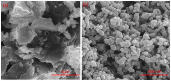 SEM analysis was carried out for the parent Mg-Ca-Al-LDH and Mg-Ca-Al-LDO samples, and the corresponding images are displayed in Figure 5. As shown in Figure 5a, the Mg-Ca-Al-LDH composite contains flakes resembling sharp edges with irregular particles, which confirms the LDH layered structure. Meanwhile, after calcination, the layered structure was converted into spherical particles with an average particle size of 40–50 nm.