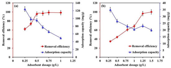 The influence of Mg-Ca-Al-LDO composite dosage on the removal efficiency and adsorption uptake of EBT and Cr is illustrated in Figure 7. Regardless of the utilized pollutant, the removal efficiency was increasing with Mg-Ca-Al-LDO dosage due to availability of additional unoccupied sites on the surface of Mg-Ca-Al composite upon increasing their quantities. For instance, the EBT removal efficiency increased from 62% to 98% with increasing the dosage from 0.25 to 0.75 mg/L, and Cr removal efficiency enhanced from 35% to 69% by increasing the adsorbent dosage from 0.25 to 1.25 g/L. At a certain dosage, 0.5 g/L for EBT (see Figure 7a) and 1.25 g/L for Cr (see Figure 7b), the removal efficiency was more than 95%, and further increasing the Mg-Ca-Al-LDO dosage had no significant impact on the removal efficiency; hence, these amounts appear to be the optimum dosages for EBT and Cr removal at the utilized conditions. Increasing the Mg-Ca-Al-LDO dosage is interconnected with providing more adsorption sites against a constant concentration of pollutant, which in turn improves the removal efficiency. In contrast, the adsorption capacity decreased with Mg-Ca-Al-LDO dosage, which can be explained by the inverse relationship between the adsorption capacity and the dosage of the adsorbent.