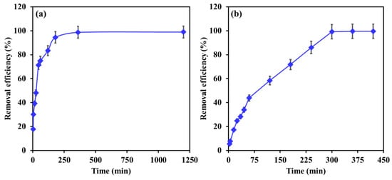 Figure 8a,b displays the impact of contact time on the removal efficiency of EBT and Cr by Mg-Ca-Al-LDO composite. Different trends were observed for the removal of EBT and Cr as a function of contact time. For EBT (see Figure 8a), the removal efficiency increased significantly in the first 45 min, during which more than 71% of EBT was removed. This fast removal is attributed to the availability of high amounts of active sorption sites at the surface of the adsorbent. Next, a slower rate of removal was obtained by increasing the contact time to 180 min until the equilibrium was achieved after 360 min of contact time. The slow adsorption can be ascribed to the diffusion of EBT particles within the pores of the adsorbent until saturation. For Cr, the removal efficiency smoothly increased with contact time to more than 99% within 300 min, after which equilibrium was achieved. The smooth increase in the removal efficiency might be attributed to one step in the adsorption process, which will further investigate in the kinetics section.