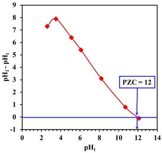 The adsorption behavior of Cr and EBT by LDHs can be clarified by estimating the surface charge of the Cr and EBT molecules as well as the pHPZC of the Mg-Ca-Al-LDO. The pHPZC of the Mg-Ca-Al-LDO was evaluated by the pH drift method, and it was found to be around 12, implying a positively charged adsorbent at pH <12, as demonstrated in Figure 9. The effect of pHi on the removal efficiency of EBT and Cr was investigated in pH ranges of 2.3–7 and 2.6–10.7, respectively, and the results are illustrated in Figure 10. Raising the pHi from 2.3 to 7.0 was found to slightly decease the removal efficiency of EBT from 79.8% to 73.5%. However, the removal efficiency of Cr was 97 ± 2% in the investigated pH range, indicating no significant effect of the solution acidity on the removal of Cr by Mg-Ca-Al-LDO.