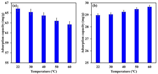 The influence of increasing the temperature from 22 °C to 60 ℃ on the adsorption capacity of Mg-Ca-Al-LDO composite for EBT and Cr is illustrated in Figure 11. The results demonstrate a reduction in the adsorption capacity of the Mg-Ca-Al-LDO toward EBT from 65.8 mg/g to 62.7 mg/g by raising the temperature from 22 °C to 60 °C. In contrast, the adsorption capacity of the Mg-Ca-Al-LDO for Cr was found to slightly increase from 29.0 to 29.8 mg/g by increasing the temperature from 22 °C to 60 °C. These outcomes suggest an exothermic adsorption process for EBT and an endothermic adsorption process for Cr by Mg-Ca-Al-LDO composite. However, the maximum reduction in the adsorption capacity of the Mg-Ca-Al-LDO for EBT was less than 5%, while the enhancement in Cr removal was not more than 3%, indicating that the Mg-Ca-Al-LDO composite can withstand the variation in temperature required for the removal of both pollutants. It was reported that the adsorption temperature affects the mobility of adsorbate ions, energy and number of active adsorption cites, as well as the interaction between the adsorbent and the adsorbate []. The investigation of thermodynamic parameters could provide better insight into the influence of adsorption temperature (see Section 3.7).