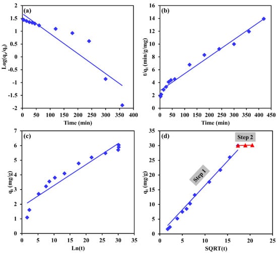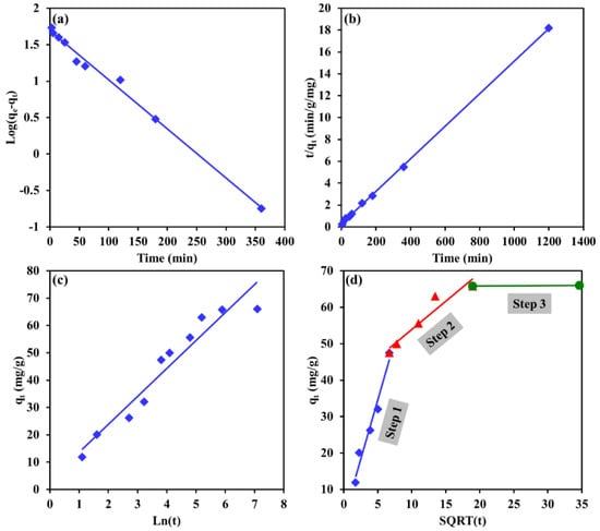 Linearized kinetic models fit of Cr removal by Mg-Ca-Al-LDO composite for (a) pseudo 1st order, (b) pseudo 2nd order, (c) Elovich and (d) intraparticle diffusion models.