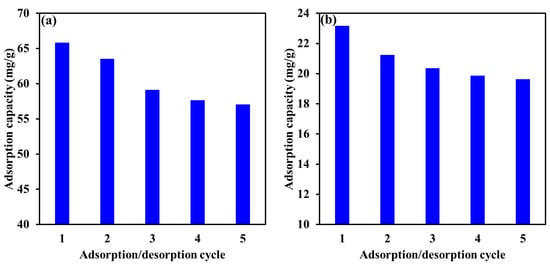 Reusability performance of Mg-Ca-Al-LDO for the adsorptive removal of EBT (a) and Cr (b) for five consecutive adsorption/desorption cycles.