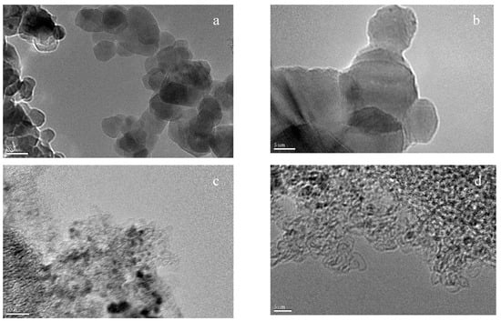 Figure 2a,b show complementary pairs of fresh crystalline n-ZnO particles. There were crystalline particles with sizes between 20 and 30 nm rather than homogeneous sizes. Figure 2c,d show the amorphous nature of activated carbon and small ruthenium particles in the range of 3–4 nm.