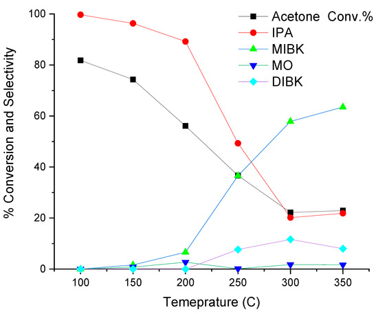A tentative reaction scheme is shown below in Figure 7. In this scheme, we included only the compounds found in considerable concentrations, namely IPA and MIBK, though present in lesser quantities. Therefore, other minor compounds, especially those observed at high temperatures, were omitted. We used the data obtained between 100 °C and 350 °C. Figure 7 depicts the hydrogenation route to IPA and the condensation route to the MO, which was not observed due to the high catalytic activity of the catalysts tested for hydrogenation.
