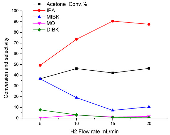 The effect of space velocity was studied at 250 °C, while keeping the acetone flow rate constant at 0.01 mL/min and changing the hydrogen flow rate. The results are shown in Figure 4. Within the experimental range studied here, the conversion did not change considerably. However, the selectivity toward IPA increased as the hydrogen flow rate increased. At a low hydrogen flow rate or low hydrogen partial pressures, other products such as MIBK and DIBK due to the parallel thermally driven reactions were observed, while at a high hydrogen flow rate or high hydrogen partial pressures (high coverage), the only plausible activity was toward IPA with suppression of addition and condensation reactions. This finding is in line with the kinetic modeling, where dissociative adsorption of hydrogen is the rate-determining step. Similar findings were observed over metallic copper supported on alumina [13], where Basu and Pradhan explained this phenomenon due to the competitive nature of multifunctional sites responsible for direct hydrogenation and MIBK synthesis.