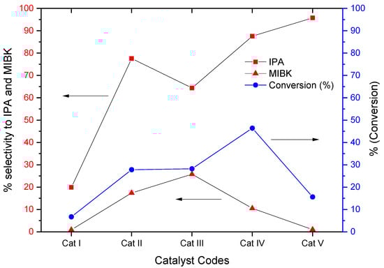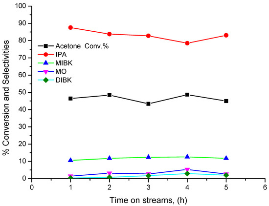 Nowadays, there is an abundance of acetone (dimethyl ketone, DMK), mainly because of dominant phenol production and its availability as a by-product of bio-butanol process and biomass conversion technologies [1]. However, acetone consumption is far less than that being produced. Major uses of acetone include the synthesis of bisphenol A, methyl isobutyl ketone, methyl acrylate, chemical heat pumps, and some minor hydrogen storage schemes. One of the prominent ways for utilizing acetone is the direct catalytic hydrogenation to IPA [2,3,4]. It is well-known that acetone condensation leads to a myriad of compounds, such as mesityl oxide (MO), methyl isobutyl ketone (MIBK), methyl isobutyl carbinol (MIBC), isophorone (IP), diacetone alcohol (DA), and some by-products, such as propane, propene, and isobutene [5].