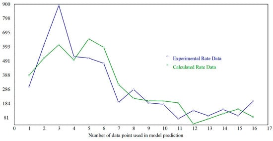 The kinetics data were collected under internal and external diffusion-free conditions. Because in the product distribution, the major compounds were composed of IPA and MIBK, a Langmuir–Hinshelwood–Hougen–Watson (LHHW) type kinetic model was selected to include these compounds [22]. The kinetic models of Basu and Pradhan [13] and also the models developed by Sen and Vannice [23] were applied after necessary data manipulations to avoid zero division in POLYMATH nonlinear regression analysis. Residuals of calculated and experimental data were minimized by the Levenberg–Marquardt algorithm, also known as the Damped least squares (DLS) method. From modeling the quality of kinetic data, we applied the models of the above-mentioned studies by using a limited set of experimental data points in which selectivity to IPA and repeatability of the experiments were of high quality. It was found that the model of Basu and Pradhan (Equation (1)), namely, dissociative adsorption of hydrogen, was assumed to be the rate-determining step.